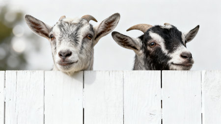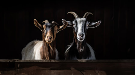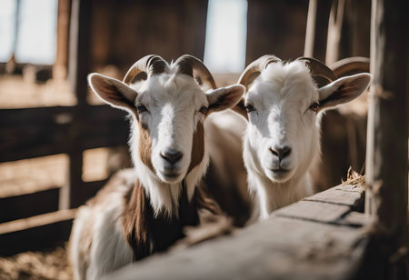 Two curious goats stand side by side, looking out from a rustic barn. The wooden structure adds charm as sunlight streams in, highlighting their playful expressions.
