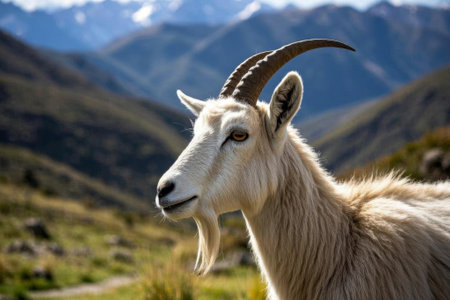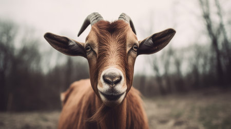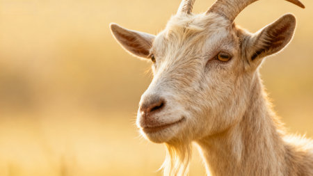 The goat gazes curiously, showcasing its large amber eyes and soft fur. Background features warm tones from foliage, creating a serene, rustic atmosphere during daylight.