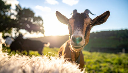 A friendly and curious brown goat pauses in a lush green pasture, looking directly into the camera. The warm, golden light of a setting sun creates a beautiful lens flare, highlighting the peaceful and idyllic atmosphere of rural farm life.