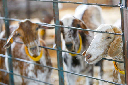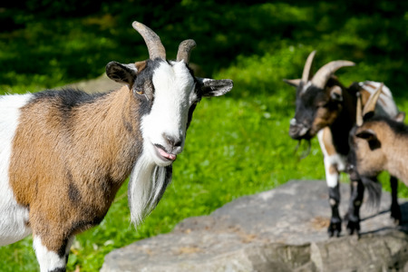 Portrait of beautiful and cute goats standing on the green meadow near the forest (free range) and posing to camera. Crazy goats are feeding and jumping on the fence in autumn time.