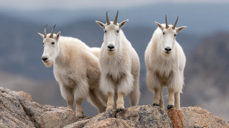 Three mountain goats stand confidently on rocky outcrops, surrounded by majestic mountains, highlighting their unique features and serene environment in nature.