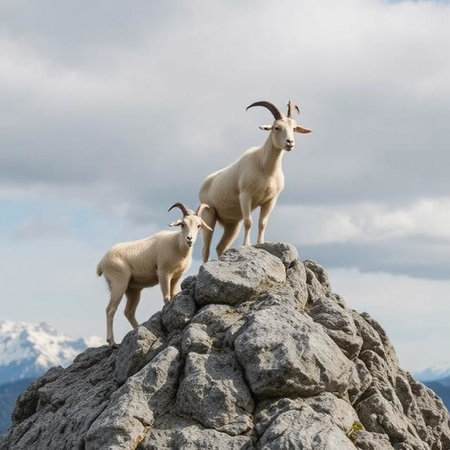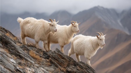 Three white goats stand on a rocky ledge, showcasing their fluffy coats against a backdrop of majestic mountains under a cloudy sky, capturing the essence of nature.