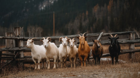 A group of seven goats stands proudly in front of a rustic wooden fence. The scenic mountain landscape and forest backdrop create a tranquil atmosphere.