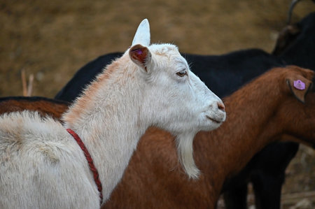 Portrait of sweet funny goat on background of other goats grazing in countryside. Cute white goats standing in green meadow in calm sunny day on farm.