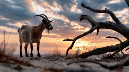 A stunning goat stands against a backdrop of a vibrant sunset, with dramatic clouds and barren tree branches, creating a serene desert landscape.