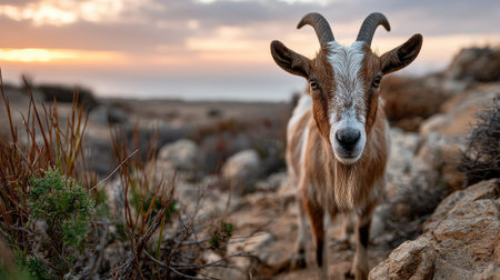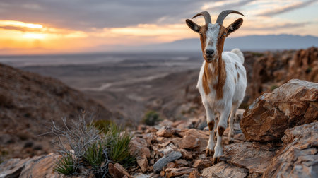 A curious goat stands on rocky terrain during a stunning sunset, showcasing its unique features against a picturesque landscape. A perfect nature shot.