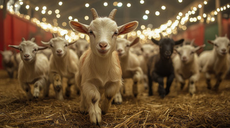 A group of goats moves energetically through a barn adorned with string lights. The warm glow enhances the lively atmosphere as the animals playfully engage with each other.