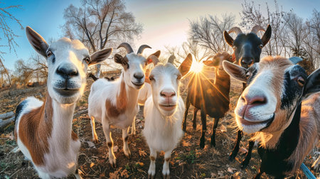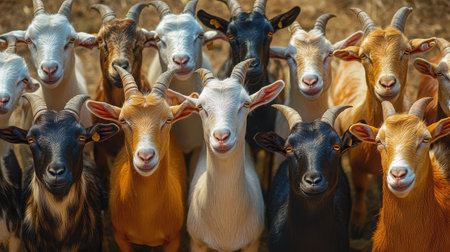 A lively collection of goats of various colors and breeds stands together in a sunny farmyard, showing their playful and curious expressions. The warm atmosphere highlights their unique features.