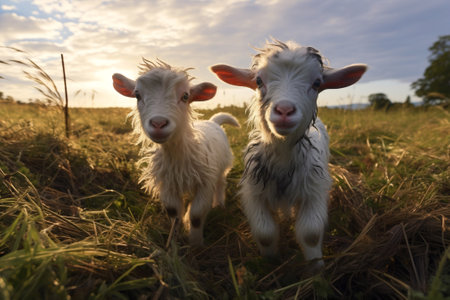 Goats grazing in a serene green pasture during sunset with golden light illuminating the landscape