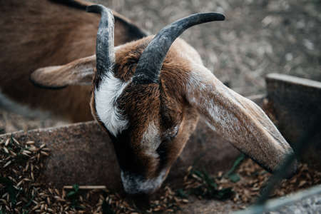 Goat in the zoo. Goat in the park. Animal in the nature.