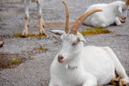 Close up brown goat concept photo. Lakeside landscape. Side view photography with flock of domestic cattle on background. High quality picture for wallpaper, travel blog, magazine, article