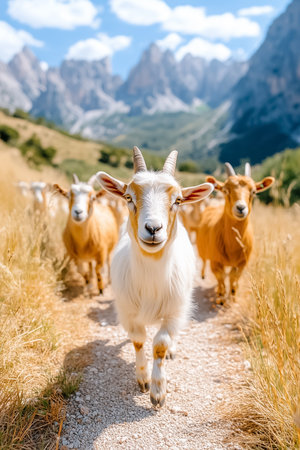 A herd of goats makes its way along a winding dirt path, showcasing a harmonious blend of nature. Distant mountains rise majestically, creating a tranquil atmosphere in this rural setting.