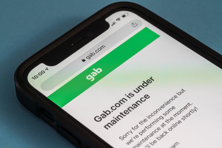 Morgantown, WV - 12 January 2021: Modern iphone with gab social media site down for maintenance and out of service