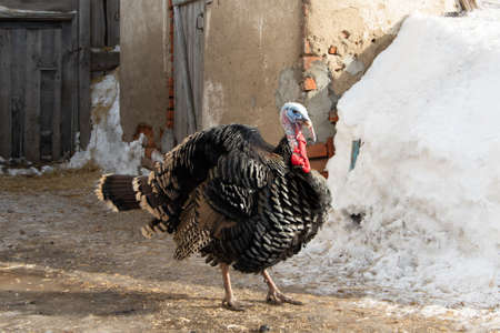 Portrait of a bronze turkey on a background of village buildings. Thanksgiving Bird Growing.