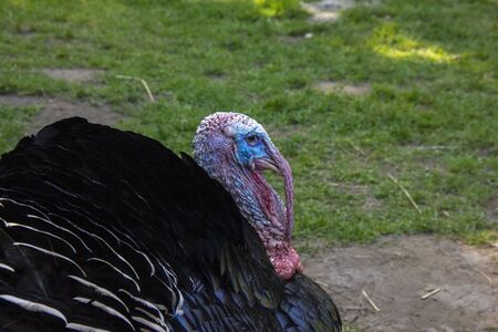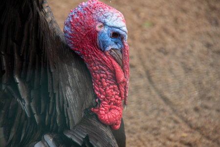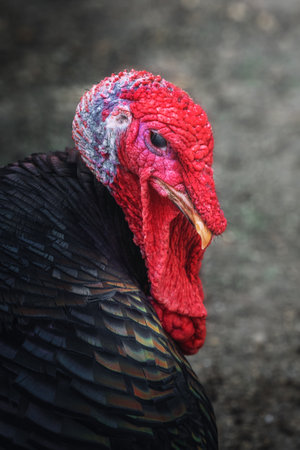 A close-up of the red and blue head of a black male turkey in a farmyard. Ecological poultry farming. Picture taken on a cloudy day, soft light.