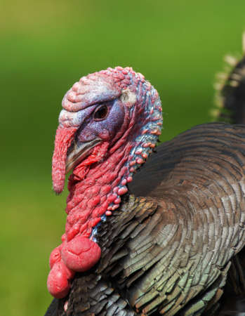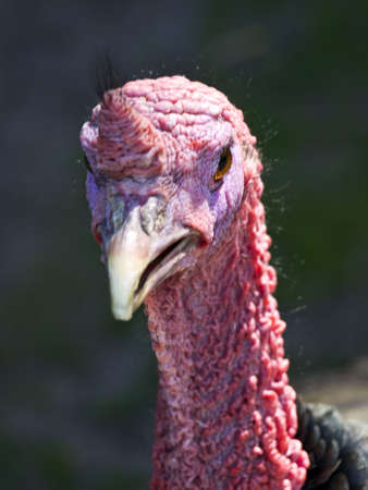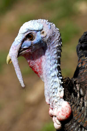 The dashing and muscular face of a male turkey. This animal commonly cultivated by humans has the scientific name Meleagris gallopavo.