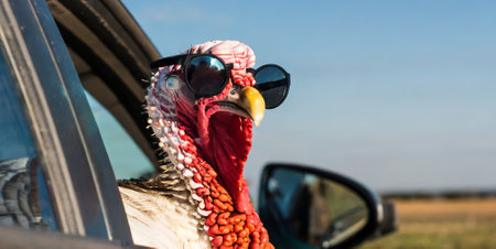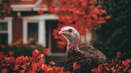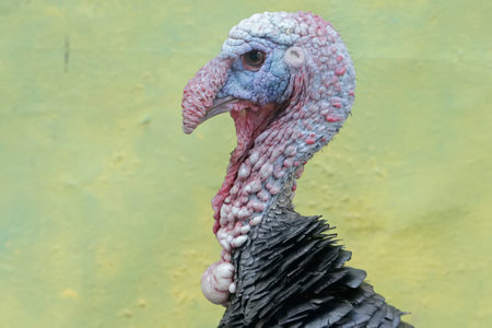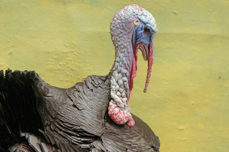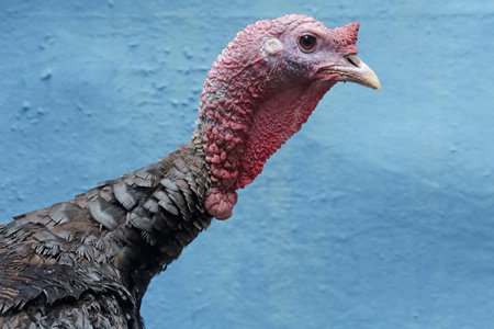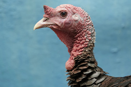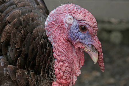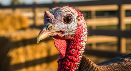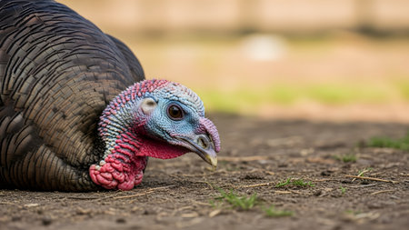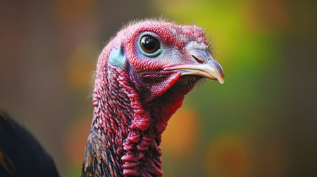 A detailed view of a turkey's head showcases its unique wattle and caruncles, perfect for Thanksgiving celebrations