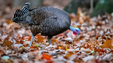 A striking wild turkey is seen foraging through a carpet of autumn leaves. The vibrant plumage and distinctive colors contrast beautifully in nature's setting, showcasing the beauty of wildlife during the fall season.