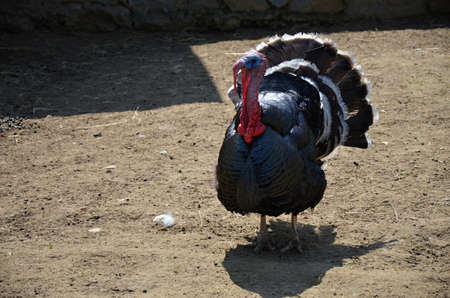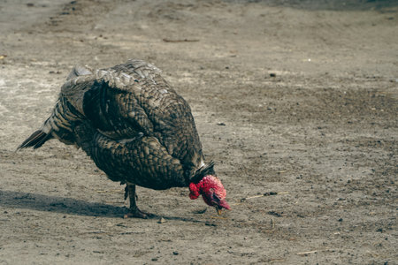 Turkey a pecking on stony ground. The turkey is very large in the countryside. Subsistence farming