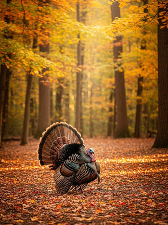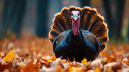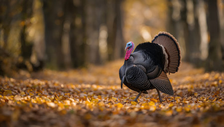 A stunning wild turkey stands proudly amid colorful autumn leaves in a serene forest setting. The bird's vibrant feathers and unique display capture the beauty of nature.