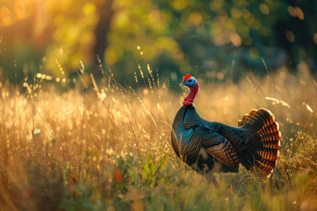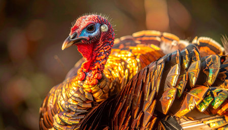 A majestic wild tom turkey stands proudly, its iridescent feathers glowing with a metallic sheen in the warm, golden light of a late afternoon. This intimate portrait captures the vibrant colors and intricate details of its head and plumage, set against a soft, natural bokeh background, symbolizing the untamed beauty of wildlife.