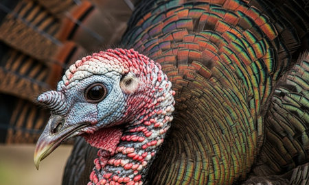 Vivid closeup shot capturing the detailed textures and colors on a turkeys head