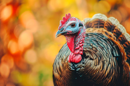 A stunning close-up portrait of a turkey showcasing its vivid feathers and intricate details. This image captures the beauty and texture of this unique bird.