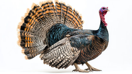 A wild turkey in full display mode, with feathers fanned out and head held high, set against a stark white background to highlight its colorful plumage.