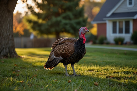A turkey wild standing proudly on a lush green lawn in front of a suburban house with white siding.