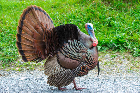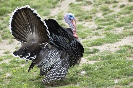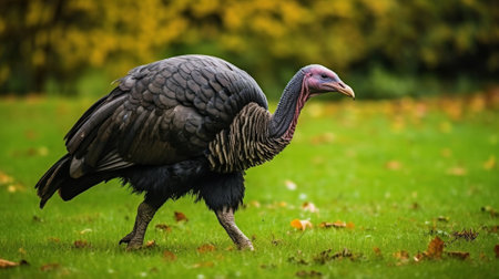 Wild turkey standing on one leg in the grass, popular bird specie from Mexico and Europe, christmas and thanksgiving animal