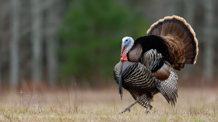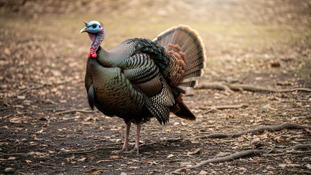 A wild turkey stands proudly in a forest setting, showcasing its plumage. The bird displays brown, black, and blue hues. The composition employs shallow depth of field, suggesting a natural environment. This image could be used for editorial content and nature-related advertising.