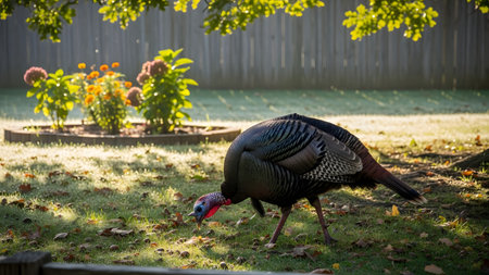 A wild turkey foraging for food in a grassy backyard garden bathed in sunlight. Flowers and a wooden fence are visible in the background, creating a peaceful suburban or rural scene.