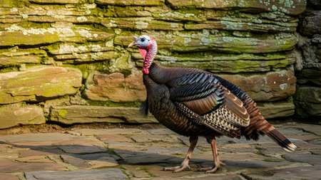 A wild turkey walks confidently across a stone path next to a rustic rock wall. The bird's iridescent feathers and red wattle are clearly visible in the natural outdoor lighting.
