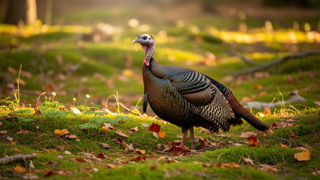 This striking image captures a wild turkey proudly displaying its colorful feathers in a sunlit forest during autumn, evoking a sense of natural beauty and serenity.
