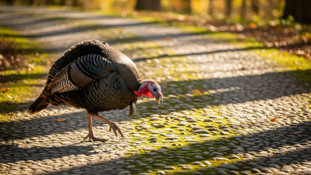 A wild turkey walks across a cobblestone path dappled with sunlight and shadows. The bird's textured feathers and the rustic ground create a natural and detailed wildlife scene.