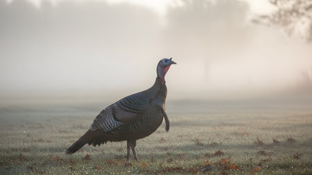 Close-up of a turkey in a foggy field, showcasing its unique colors and features, with a tranquil atmosphere.