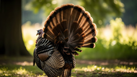 A wild turkey displays its magnificent fanned tail feathers in a sunlit forest setting. The back view captures the intricate patterns of the plumage against a soft, blurred background of trees and foliage.