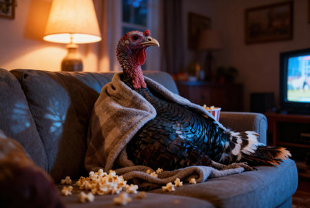A turkey enjoys a cozy evening in, wrapped in a blanket with a bowl of popcorn nearby
