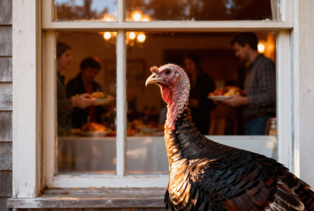 A curious turkey looks on as a family prepares for a festive meal inside a warm home