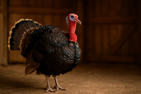 AI generated image of a turkey in a barn with warm indoor lighting, soft shadows highlighting the texture of the feathers and rustic wood interior.