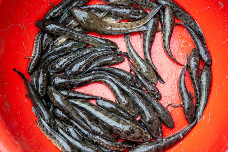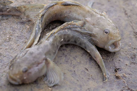 Three barred mudskippers are resting. This fish, which is mostly done in the mud, has the scientific name Periophthalmus argentilineatus.