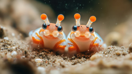 Two vibrant sea creatures rest on the sandy ocean floor showcasing their colorful appendages and curious expressions in clear water.