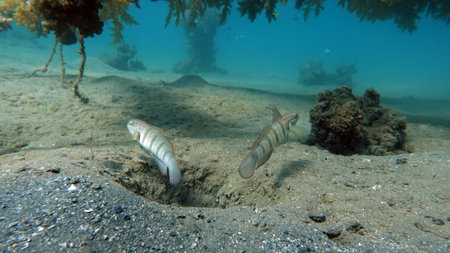 Two barred mudskippers are resting. This fish has the scientific name Periophthalmus argentilineatus.