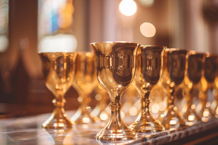 Row of polished golden chalices gleams with a soft bokeh background