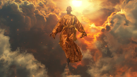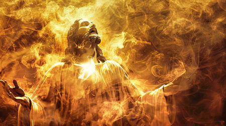 An illustration depicting Jesus Christ ascending through flames, radiating golden light.