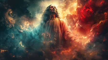 man in white robes with long hair stands among glowing, orange, and blue clouds, reaching out with his hands. A fiery sunset illuminates the scene.