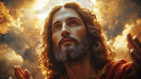 Close-up of Jesus Christ praying to his Father in heaven