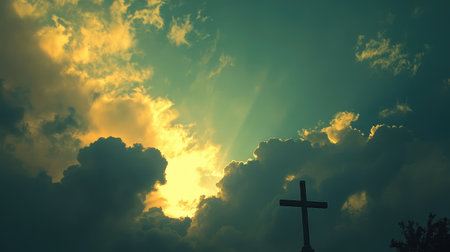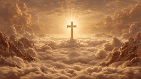 A breathtaking scene featuring a radiant cross emerging from golden clouds at sunrise. This image encapsulates themes of hope, spirituality, and divine beauty.