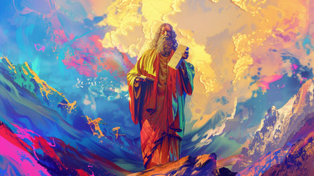 A majestic figure stands amid a surreal landscape bursting with color and energy, evoking themes of wisdom, spirituality, and creative inspiration.