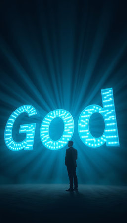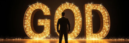 Businessman standing in front of the word God made of glowing lights